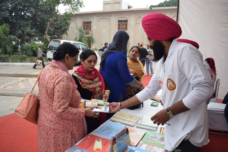 Volunteers exhibiting books published in line with missions of Living with Gurbani and Nature care