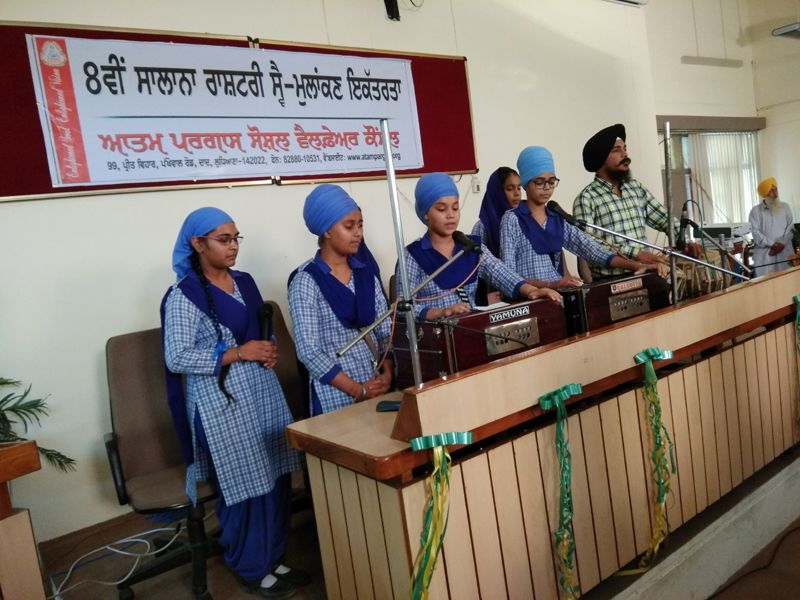 Students doing the Shabd Gayan at the start of the function.